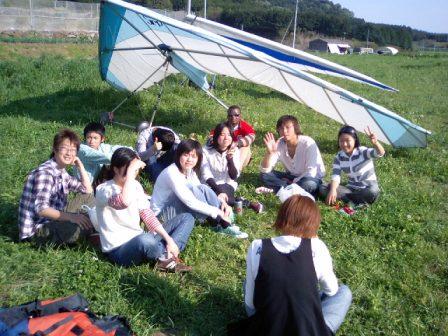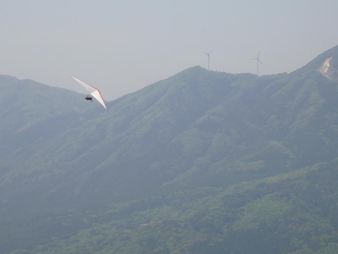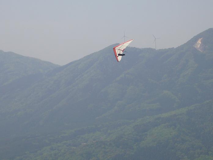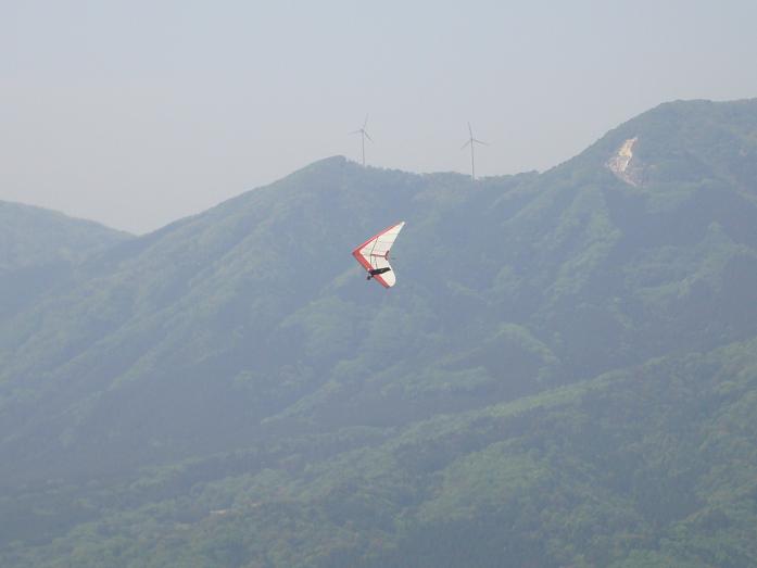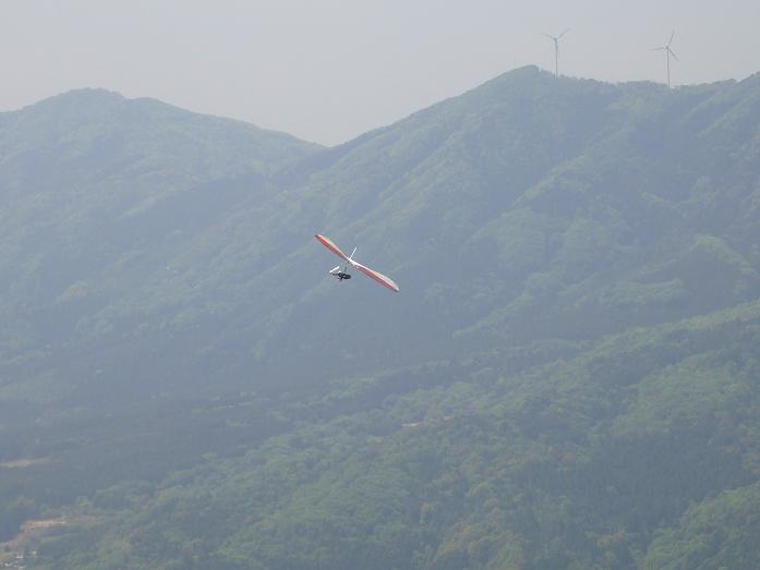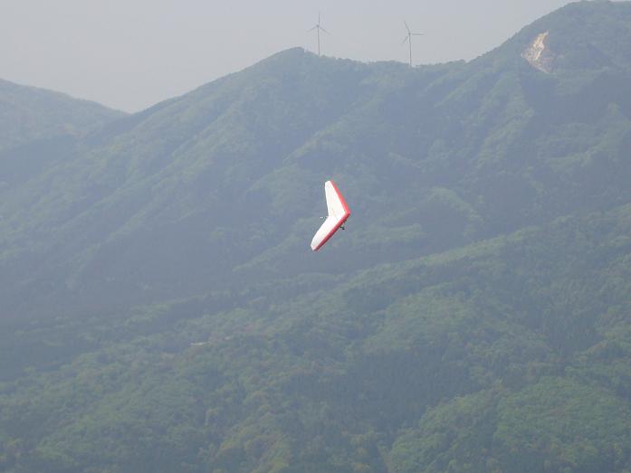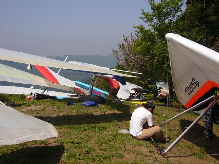 自分は板敷に行くのが三月のトントントンカップ以来だったのでとてもとても楽しみにしていました。久しぶりに飛べるし他大の新入生にも会えるしね。五日土曜日の昼前に到着する新入生たちを空かお出迎えしようと、早く寝て次の日に備えようと思っていましたが、、、結局朝まで飲み語り明かしてしまいました。やっぱ板敷は和む所だ。 まぶしい朝日の中、もはや寝る時間でもないので朝食をとって山上げの準備。予報どおりのいい天気。しかし朝から風が強かったかな。 風は基本的に南風だったけれど、LDが西風っぽかったりして降りにくそうだったので安定するまでテイクオフで待つことにする。 そんななかテイクオフ前でグングン揚げるグライダー 正午を過ぎて、ランディングではBBQが始まったようなのでテイクオフ。ポコポコとサーマルを感じるのだがうまく機体を乗せることが出来ない。大覚寺上空であがっているM松さんの下にもぐりこんでソアリング。上がりはするもののM松さんとはどんどん高度に差がついてくる。結局サーマルを見失いランディングへ。 降りて機体を畳んでBBQに参加。新入生の何人かは新歓などで一度会ったことがあったけど初めて会う人の方が多かった。みんなお腹いっぱいになったかな。 先週の土日(五月の五日六日)は新入生を交えてのGW合宿。新入生は12人くらいきてくれていたかな。
