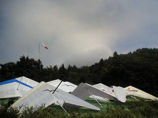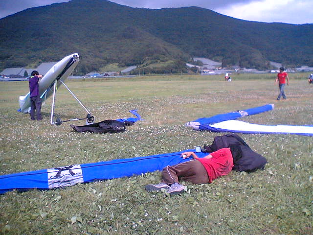 日の出前に板敷を出て、十分一に着いたのが何時だったか。多分九時半くらい。 今まで十分一へ飛びに行ったのが講習生の時、ピンクカップ、雪の残る三月だったので青空の眩しい快晴の十分一は新鮮でした。 一本目は何事もなくゆったりとぶっ飛び。ランディングでちょいとミスってしまった。それにしても十分一のLDは広い、昔はこの広さでもアウトランディングしていた時があったんだなぁと思うとなさけない。 リフライトの2本目、テイクオフ前でパラ・ハングともにあげているのでいそいそと出る。出てさっそくサーマルを捕らえてセンタリング開始。そのままタカツムジ側へ流れながら上げ続けて気がつけば雲底。対地1000くらい。しかしサッパリ上がらなくなったので尾根沿いに前へ出る、白龍湖上空、自分の影が湖面に映る!高さに余裕があるのでヘロヘロ田んぼの上を飛んでると弱いサーマルをみつけるもステイできるくらいで上がらない。上がらないまま高度をなくしてランディングへ。 センタリングの練習になった。もっとソアリング上手くならなくては。。 今年の滝浜BBQは、なんと雨天決行。雨がぱらつきながらも午前中はグラハン講習。やっぱ毎週来てるような一年生は上達が早いね、夏はさっくりB級とれるかな。